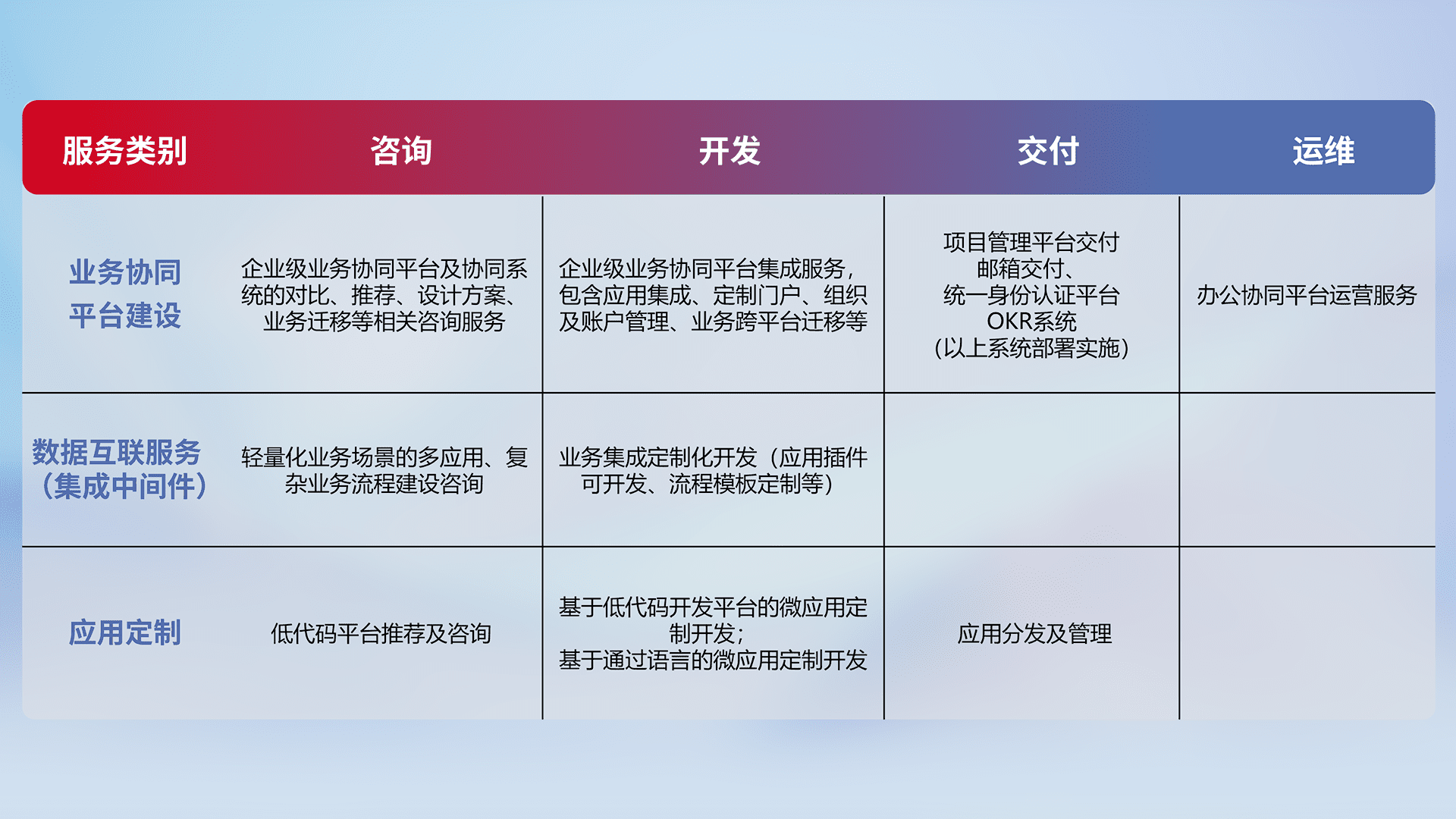 针对钉钉、、、、企微、、IDaas等平台级产品提供产品的规划、、、方案、、交付、、、定制化开发等服务,,实现如统一协同办公、、、、智能客户服务、、、混合会议管理、、智能数据查询、、等业务场景,,,实现数字化转型。。